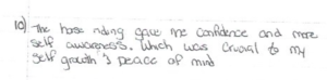 Kristy rode a horse named Hank. She was scared at first, she said, but Hank stayed calm, and that helped her relax. Her fear diminished. Her confidence increased.